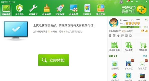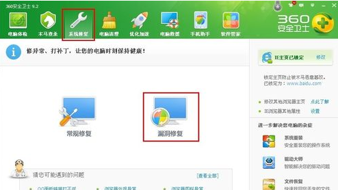 步骤二:360系统蓝屏修复功能是不会自动运行的,需要你自己打开。打开方法可以是你安装修复漏洞后提示你打开,也可以是自己打开。