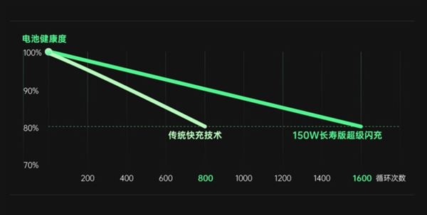 长寿版150W超级闪充技术,5分钟即可从1%最高充至50%(4500mAh电池),最快15分钟充至100%。