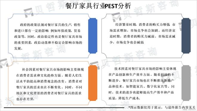 政治因素对餐厅家具市场的影响主要体现在政策法规和政治稳定性方面。政府的政策法规对餐厅家具的生产、销售和进口都有一定的影响,例如环保政策、贸易政策等。同时,政治稳定性也是餐厅家具市场的重要因素,政治动荡和不稳定会影响市场的发展。经济因素对餐厅家具市场的影响主要体现在消费者购买力和市场竞争力方面。经济繁荣时期,消费者的购买力增强,市场需求增加,市场竞争也会加剧。而经济衰退时期,消费者的购买力减弱,市场需求减少,市场竞争也会减弱。社会因素对餐厅家具市场的影响主要体现在消费者需求和文化趋势方面。随着人们生活水平的提高和消费观念的改变,消费者对餐厅家具的需求也在不断变化。同时,不同地区和文化背景的消费者对餐厅家具的需求也存在差异。技术因素对餐厅家具市场的影响主要体现在产品创新和生产效率方面。随着科技的不断进步,餐厅家具市场也在不断推出新的产品和技术,如智能家具、数字化家具等。同时,技术的进步也能够提高生产效率和产品质量,降低生产成本。